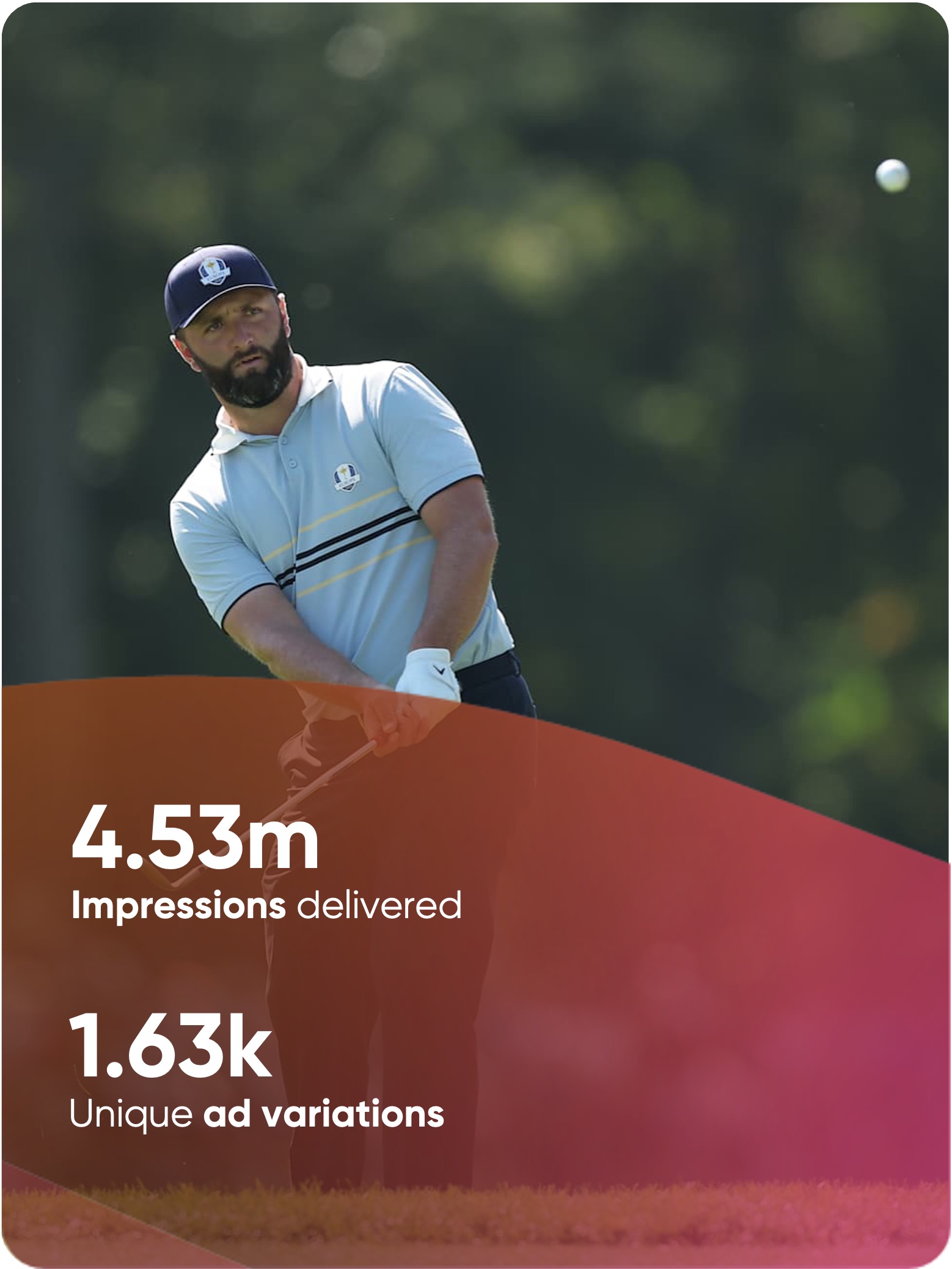 Instead of generic "watch it now" messaging, our dynamic engine generated 1,633 unique ad variations in real-time. Whether Team Europe was "3½ points up" or "fighting to hold out," the creative reflected the exact state of play, specific match-ups (e.g., Rahm vs. Cantlay), and the emotional temperature of the tournament.